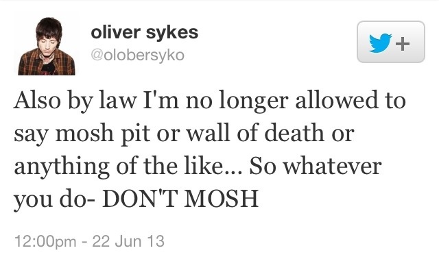 Moshing was made illegal in the city of Boston in 2012, and to the best knowledge of TBOS, there hasn’t been any more recent legislation put into action. Kevin Lyman, the promoter of Warped Tour, where BMTH are performing, assured his Twitter followers that moshing has not been outlawed on the tour, but bands are not allowed to encourage it due to possible legal problems.