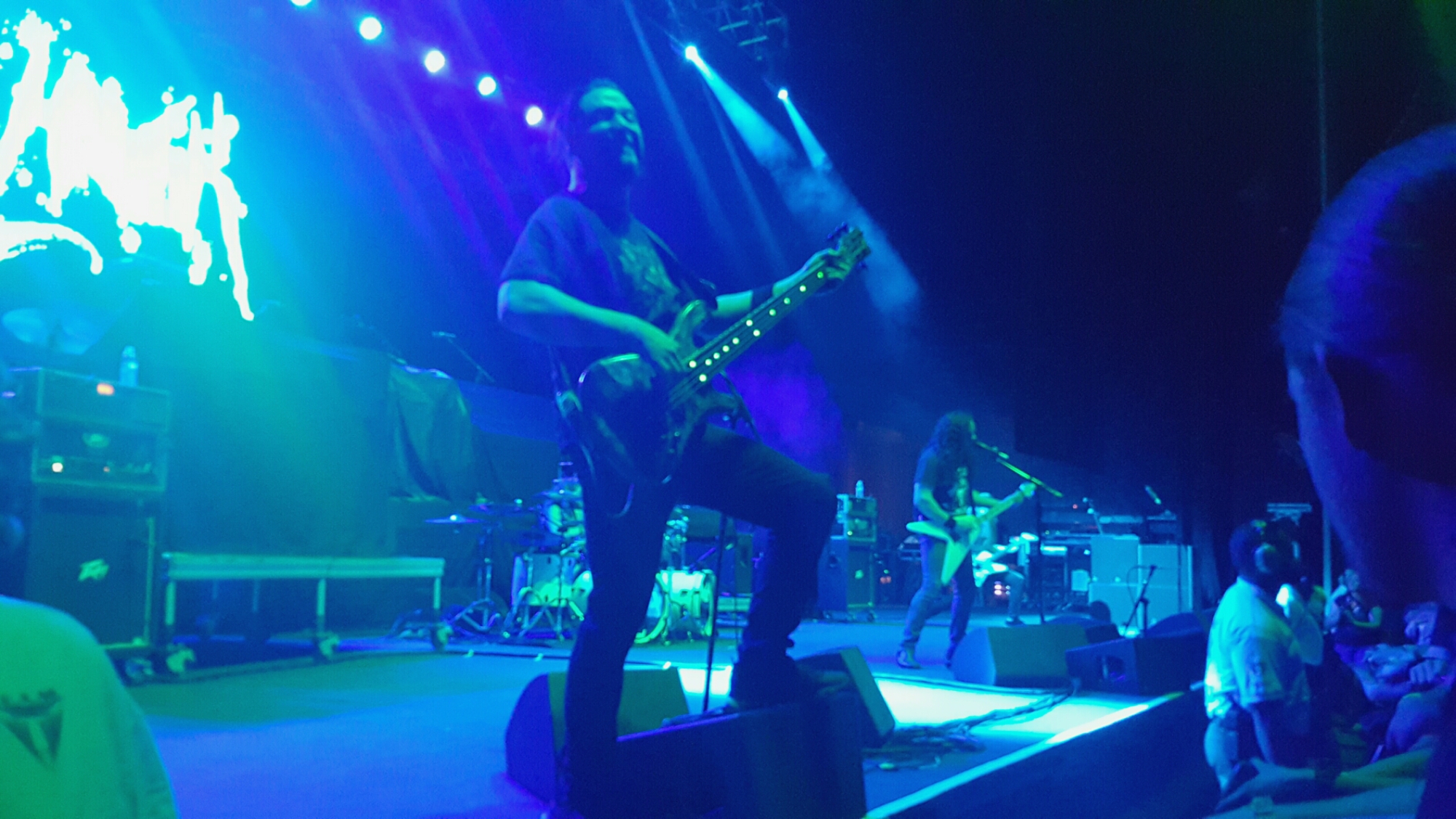 Suicidal Tendencies opened with a ripping version of “You Can’t Bring Me Down,” and singer Mike Muir was running and jumping all over the stage throughout their whole set. None other than Slayer’s Dave Lombardo was behind S.T.’s kit. Their dynamic seven-song set was filled with hits like “Institutionalized” and “I Saw Your Mommy”. The crowd was going wild, with plenty of people headbanging, moshing, and crowd-surfing. Even though they had small rigs (the guitarists only had half-stacks), they were the best-sounding band of the night so far, and definitely the most energetic.